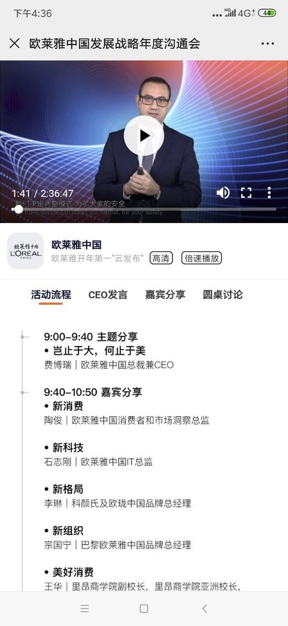 上海,2020年3月5日 – 惊蛰时节,万物复苏。春回大地之际,在华深耕23年的中国第一大化妆品集团欧莱雅以十五年最高业绩增速,再次为在中国的发展前景注入“强心剂”。今日,在战“疫”的特殊时刻,欧莱雅中国总裁兼首席执行官费博瑞先生携管理团队代表及嘉宾学者,首次通过“云发布”的数字化形式召开集团在中国的开年第一会——发展战略年度沟通会,回顾欧莱雅中国2019年的战绩亮点和创新实践,并宣布启动下一个10年的新战略“HUGE美好计划”,思长远谋大局,引领美的未来,打造未来的企业,与各界共创美好消费的新生态。